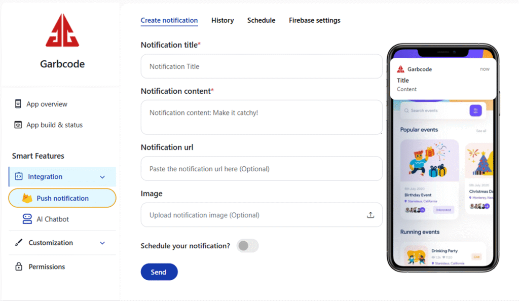 QuikApp allows you to send instant or scheduled push notifications to your app users on Android, iOS, or both platforms.